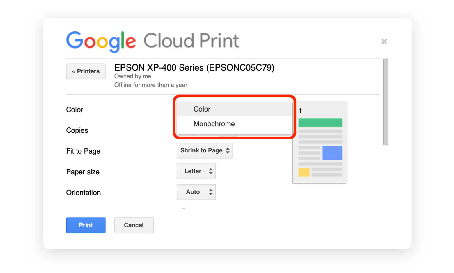Estando en tu navegador solo debes presionar CTRL + P y se abrirá la ventana predeterminada de impresión. Seguido de esto, y una vez hayas seleccionado la impresora en la que quieres imprimir, la ventana te mostrará diferentes opciones, entre las que se encuentra Color.